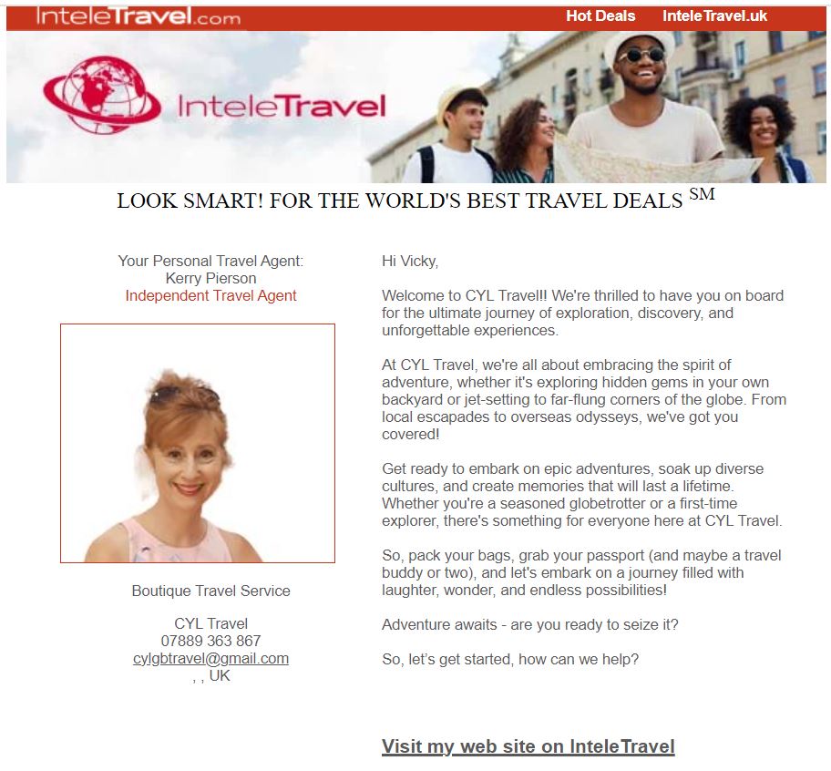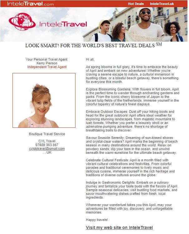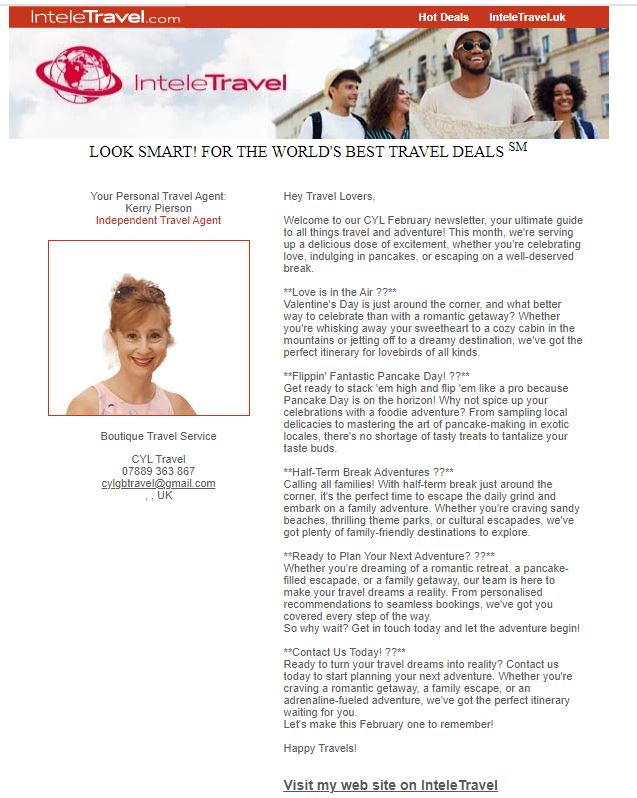 CYL Travel Newsletters Posted on 2nd Apr 20242nd Apr 2024 by Kerry Pierson April – Adventure Awaits March Madness February – The Month of Love January – Beat the Winter Blues Welcome to CYL Travel Discover more from Subscribe to get the latest posts sent to your email. Type your email… Subscribe Share this:More Click to email a link to a friend (Opens in new window) Email TweetShare on Tumblr Click to share on Threads (Opens in new window) Threads Click to share on WhatsApp (Opens in new window) WhatsApp Like Loading... Related