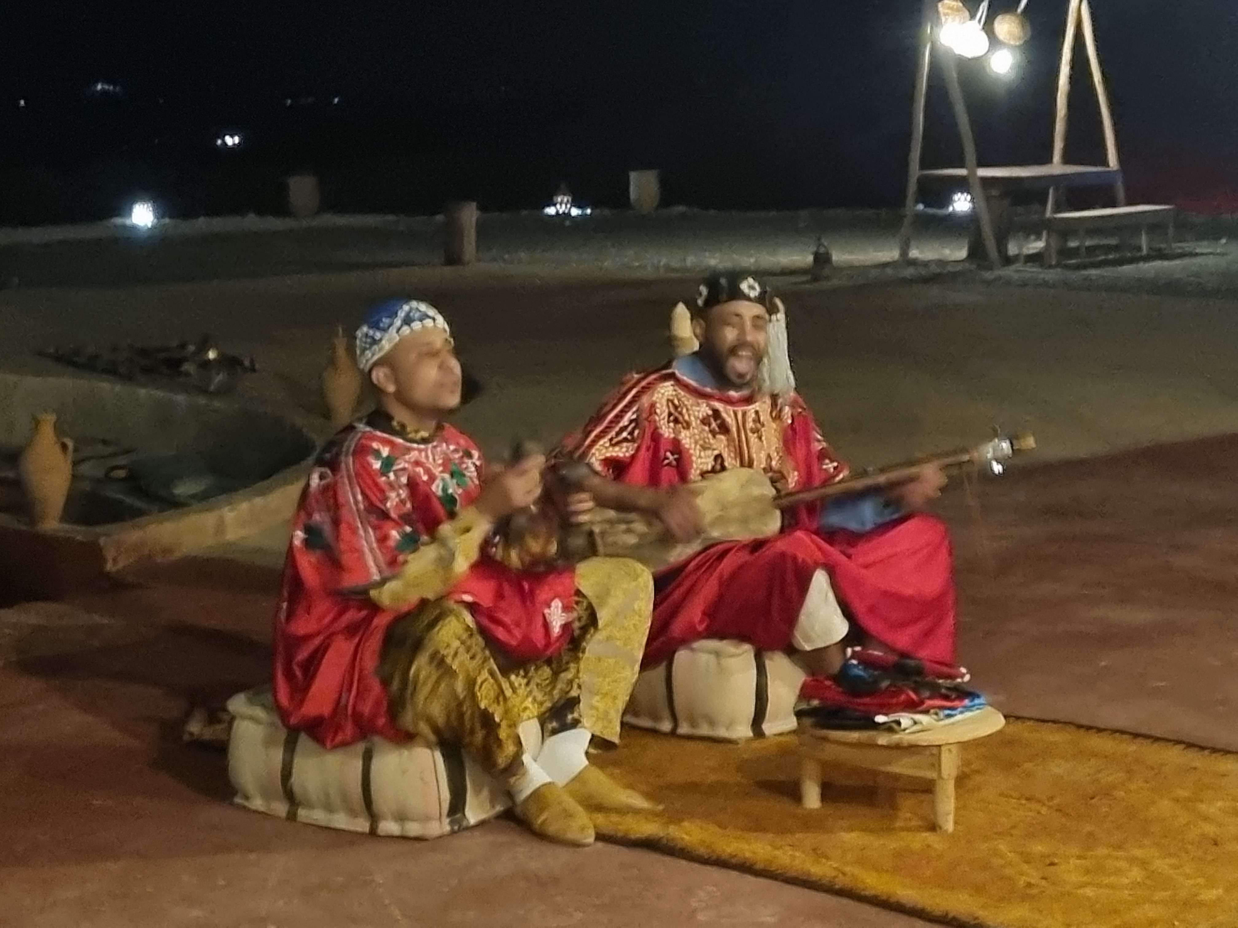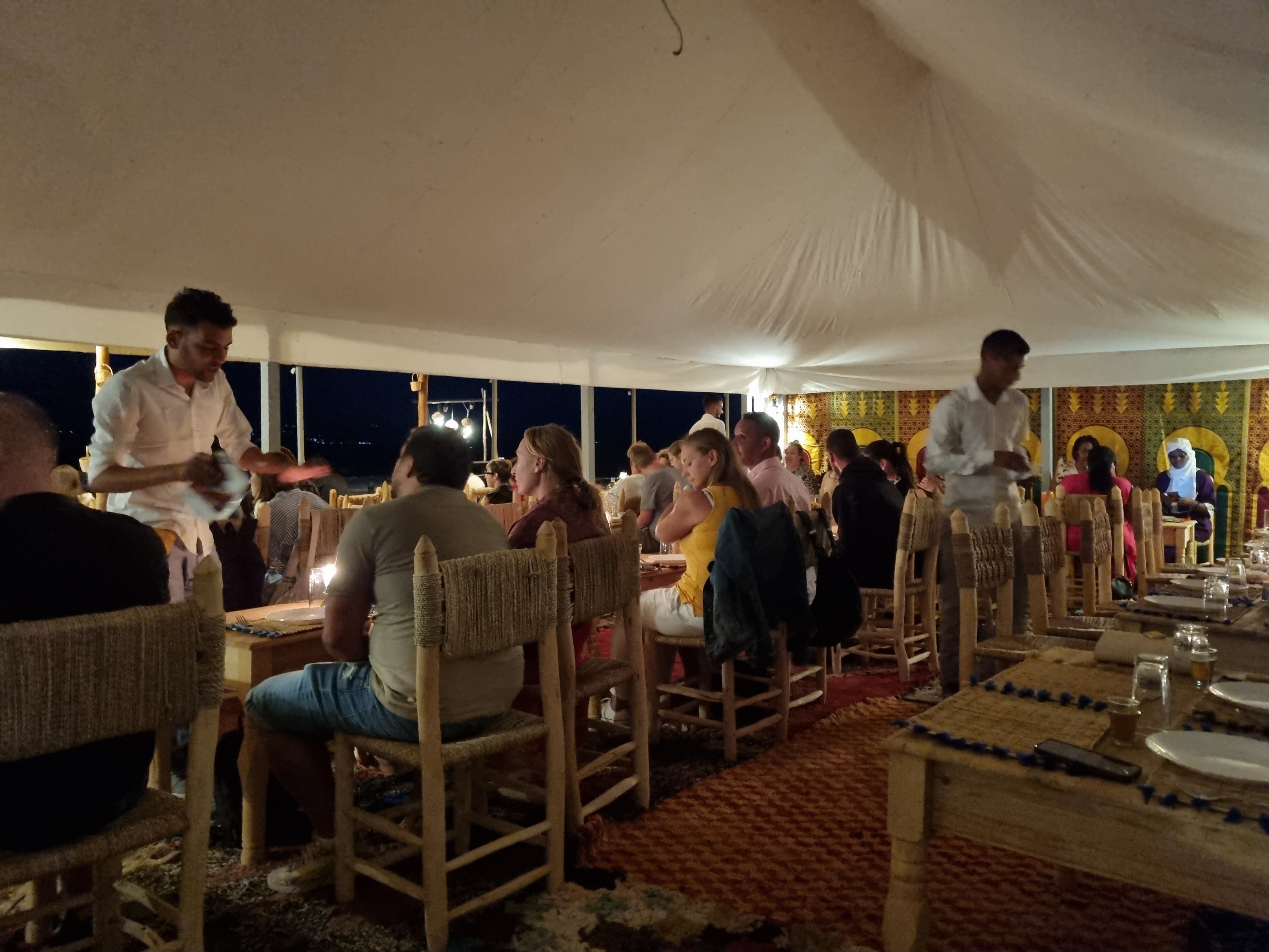 After our ride, we were treated to a magical dinner in the desert. Picture this: a beautifully set table surrounded by lanterns and Moroccan carpets, with the stars twinkling above. We feasted on traditional dishes like couscous and grilled meats, all while enjoying live music and the sounds of the desert. It was an experience straight out of a storybook—truly unforgettable!
